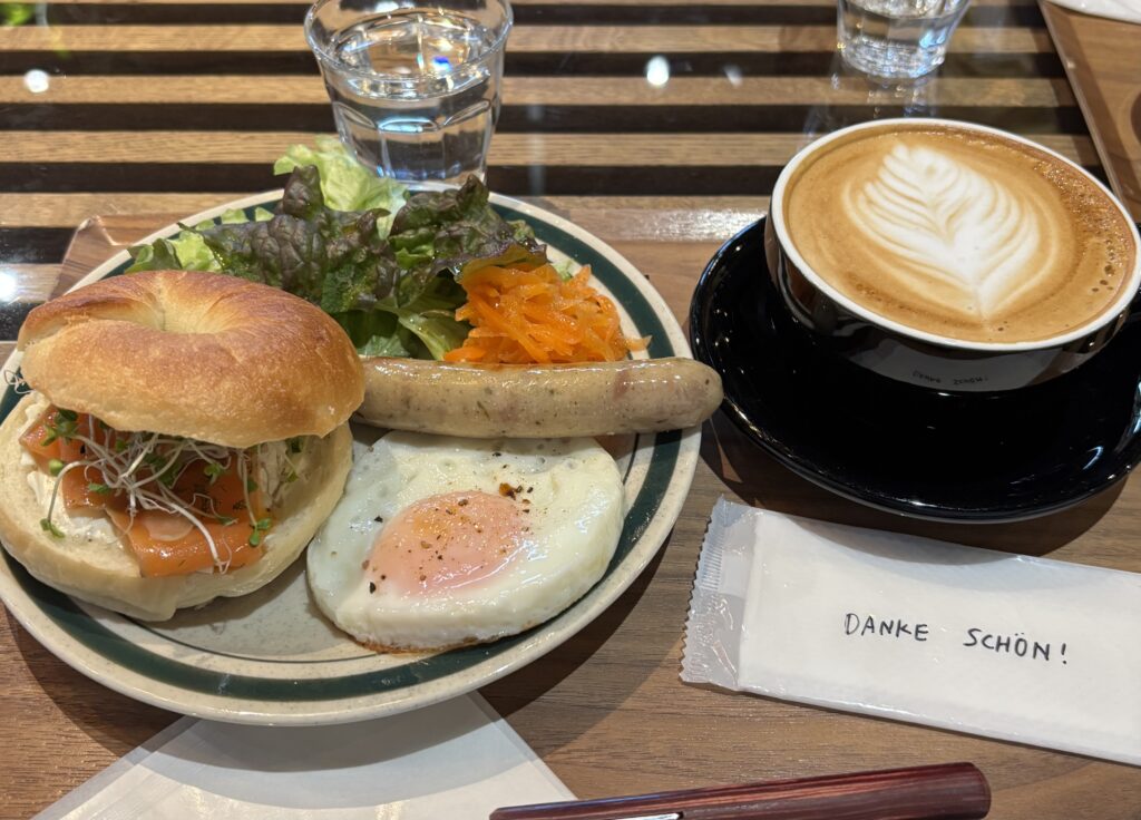 御影でオススメモーニング。 朝8:00からオープンしている ゆったり過ごせるカフェへ。 人気のクリームチーズサーモンベーグルを頂きました。(890円) +500円でセットにでき サラダや副菜もついて満足感あり! ベーグル ...